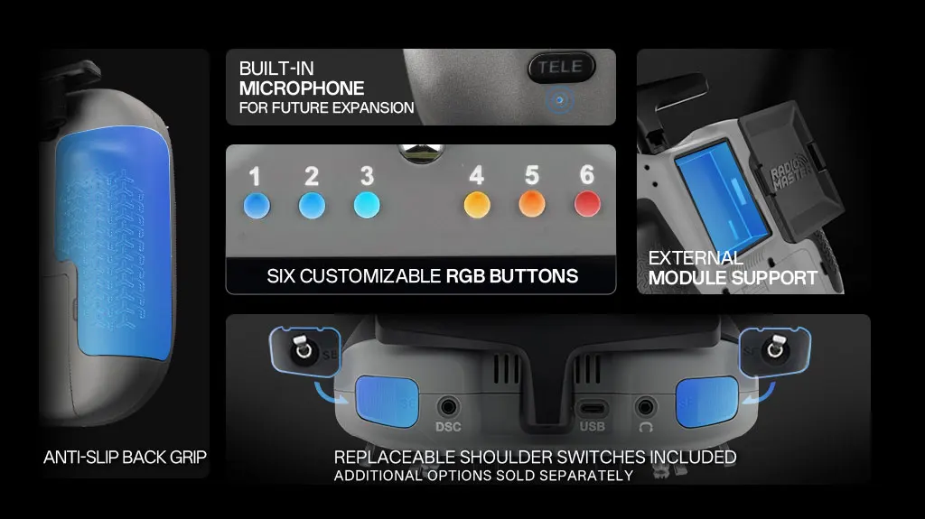 Interchangeable Shoulder Switches: Customize your controls to match your flying style.