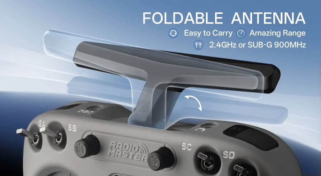 The TX15 features a LR1121 Semtech transceiver, supporting both 2.4GHz or 900MHz ExpressLRS (ELRS) for long-range, low-latency performance. Whether you're flying daily or operating in challenging RF environments, the TX15 is built to perform. A smart balance battery circuit maximizes flight time, while the compact, foldable antenna design improves portability and ensures strong signal quality. The built-in gyro with TiltX/TiltY functions unlocks advanced control options, allowing you to trigger switches, pan/tilt cameras, or activate telemetry callouts with a simple tilt of your radio.