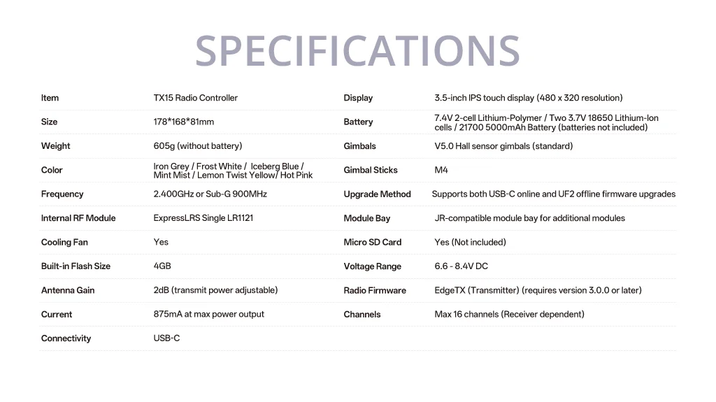 Experience clear visuals on the 3.5-inch IPS touchscreen with 262k color resolution and 600 nits brightness, visible in sunlight. The TX15 Standard features V5.0 hall sensor gimbals in six vibrant colors. It's advanced cooling, a USB-C port for charging, SIM connectivity, firmware updates, and high-speed memory access ensure reliable performance. We’ve included additional switches so you can swap out the shoulder buttons with either a momentary or two-position latching switch—perfect if you prefer a traditional switch over a button. Want a premium upgrade? Check out the TX15 MAX.